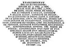 « Moi, Louis de Bougainville, Colonel des Armées de Sa Majesté Très Chrétienne, ai reçu 618 108 livre, 13 sou et 11 deniers, montant de l'Estimation que j'ai donné des Dépenses faites par la Compagnie de St. Malo, pour équipements et fondation de ses établissemens illégitimes dans les Iles Malouines appartenant à Sa Majesté Catholique, savoir "40.000 livres, payées en à compte à Paris par son Excellence le Comte de Fuentes, ambassadeur de Sa Majesté Catholique pour lesquelles j'ai donné quittance. »
