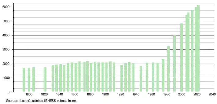L'évolution du nombre d'habitants est connue à travers les recensements de la population effectués dans la commune depuis 1793. Pour les communes de moins de 10 000 habitants, une enquête de recensement portant sur toute la population est réalisée tous les cinq ans, les populations légales des années intermédiaires étant quant à elles estimées par interpolation ou extrapolation[31]. Pour la commune, le premier recensement exhaustif entrant dans le cadre du nouveau dispositif a été réalisé en 2008[32].