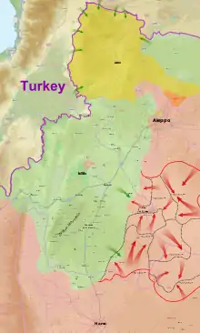 - Territoire contrôlé par Hayat Tahrir al-Cham, l'Armée syrienne libre et Ahrar al-Cham