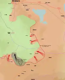 Le 9 février, les 80 villages tenus par l'État islamique passent d'un coup sous le contrôle du régime syrien, les loyalistes ouvrent alors un corridor aux djihadistes pour leur permettre de gagner le gouvernorat d'Idleb et d'y attaquer les rebelles[144],[145],[146]. L'État islamique n'est alors plus présent dans le gouvernorat d'Alep et dans celui de Hama[144],[145],[146].