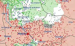 Le 9 octobre, l'État islamique passe à l'attaque et s'empare de quinze villages. Hayat Tahrir al-Cham déploie alors des renforts et lance peu après une contre-offensive[64] : rapidement, ses combattants reprennent six villages[64],[65],[66] et le 12 octobre, ils en contrôlent sept[66]. Le 13 octobre, ils reprennent le village de Rahjan (en), considéré comme le plus important[66],[67],[68]. Le 16 octobre, les djihadistes de Tahrir al-Cham s'emparent du village d'al-Mestriha[69] ; ils tentent ensuite de reprendre les villages d'Abou Laffah, al-Shakuziyyeh et Abou Al-Hawadeed, toujours tenus par l'EI[70].