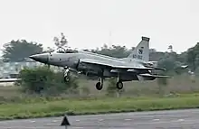Un Chengdu J-7 de l'armée de l'air pakistanaise durant un exercice international auquel les États-Unis, le Royaume-Uni, la France et la Jordanie ont participé.