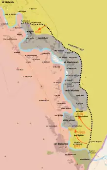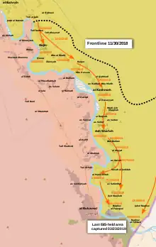Le 15 novembre, les FDS avancent d'une quinzaine de kilomètres près de la frontière irakienne et arrivent à moins de 20 kilomètres au nord de Boukamal[52]. Le 25 novembre, elles progressent à travers le désert depuis le champ pétrolier de Kashmeh et atteignent la frontière irakienne au nord-est de Boukamal[53].