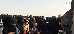 Des milliers de civils commencent alors à sortir de l'enclave contrôlée par l'État islamique, mais certains djihadistes tentent aussi de s'exfiltrer[181],[182]. Selon l'OSDH, du 12 au 19 janvier, 500 djihadistes se rendent ou sont capturés et 4 800 civils sont évacués par les FDS de la poche d'al-Soussa et de Baghouz[183],[184],[185]. Les 21 et 22 janvier, 4 900 personnes, dont 470 djihadistes, sont encore évacués[186]. Au total, 10 000 personnes sortent de la poche entre le 21 et le 27 janvier[7]. Une grande partie des civils évacués sont d'origine irakienne ou d'autres nationalités et beaucoup sont des membres des familles des combattants de l'État islamique[187]. Début février, sept femmes et filles yézidies, enlevées lors des massacres de Sinjar, parviennent à fuir la poche de l'EI[188].