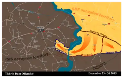 Le , les FDS poursuivent leur offensive vers le sud, le long de la rive est de l'Euphrate, et réussissent à s'emparer de plusieurs villages puis du barrage de Tichrine, situé sur le fleuve. La prise est stratégique car elle permet de franchir l'Euphrate et coupe ainsi la route reliant Manbij à Racca, et isolant ainsi cette dernière ville, fief de l'État islamique, cible désignée de la coalition dans le futur[5]. De plus, le barrage alimente en électricité les zones alentour[1]. Selon un communiqué de la coalition syrienne, cinq djihadistes sont tués durant les opérations et huit autres capturés vivants[6]. Le lendemain, les forces de la coalition syrienne franchissent pour la première fois l'Euphrate et s'emparent sur l'autre rive de la ville de Tichrine, située à l'ouest du barrage. Quinze combattants de l’État islamique auraient été tués durant ces opérations[7]. Les FDS se rapprochent ainsi à environ vingt kilomètres de la ville de Manbij, dans laquelle quatre personnes soupçonnées d'être liées aux FDS auraient été exécutées par l’État islamique.