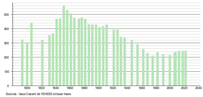 L'évolution du nombre d'habitants est connue à travers les recensements de la population effectués dans la commune depuis 1793. Pour les communes de moins de 10 000 habitants, une enquête de recensement portant sur toute la population est réalisée tous les cinq ans, les populations légales des années intermédiaires étant quant à elles estimées par interpolation ou extrapolation[51]. Pour la commune, le premier recensement exhaustif entrant dans le cadre du nouveau dispositif a été réalisé en 2007[52].