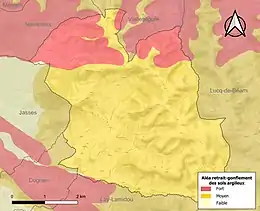 Le retrait-gonflement des sols argileux est susceptible d'engendrer des dommages importants aux bâtiments en cas d’alternance de périodes de sécheresse et de pluie[37]. 99,8 % de la superficie communale est en aléa moyen ou fort (59 % au niveau départemental et 48,5 % au niveau national)[Carte 5]. Depuis le , en application de la loi ELAN, différentes contraintes s'imposent aux vendeurs, maîtres d'ouvrages ou constructeurs de biens situés dans une zone classée en aléa moyen ou fort[Note 7],[38].