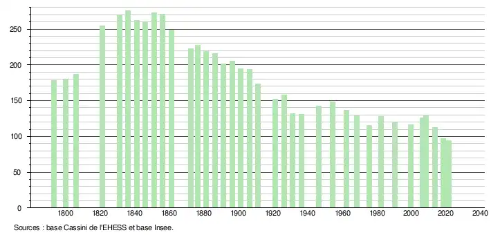 L'évolution du nombre d'habitants est connue à travers les recensements de la population effectués dans la commune depuis 1793. Pour les communes de moins de 10 000 habitants, une enquête de recensement portant sur toute la population est réalisée tous les cinq ans, les populations légales des années intermédiaires étant quant à elles estimées par interpolation ou extrapolation[16]. Pour la commune, le premier recensement exhaustif entrant dans le cadre du nouveau dispositif a été réalisé en 2008[17].