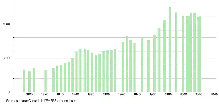 L'évolution du nombre d'habitants est connue à travers les recensements de la population effectués dans la commune depuis 1793. Pour les communes de moins de 10 000 habitants, une enquête de recensement portant sur toute la population est réalisée tous les cinq ans, les populations légales des années intermédiaires étant quant à elles estimées par interpolation ou extrapolation[25]. Pour la commune, le premier recensement exhaustif entrant dans le cadre du nouveau dispositif a été réalisé en 2004[26].