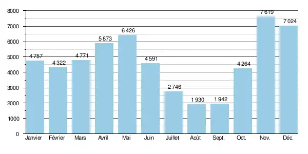 L'Ogooué est un fleuve abondant, bien alimenté en toutes saisons et donc assez régulier. Le débit moyen mensuel observé en août (minimum d'étiage) atteint 1 930 m3/s, soit quatre fois moins que le débit moyen du mois de novembre, ce qui montre une irrégularité saisonnière réduite. Sur la durée d'observation de 46 ans, le débit mensuel minimal a été de 979 m3/s, tandis que le débit mensuel maximal s'élevait à 11 300 m3/s.