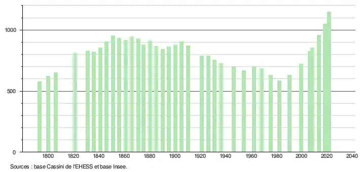 L'évolution du nombre d'habitants est connue à travers les recensements de la population effectués dans la commune depuis 1793. Pour les communes de moins de 10 000 habitants, une enquête de recensement portant sur toute la population est réalisée tous les cinq ans, les populations légales des années intermédiaires étant quant à elles estimées par interpolation ou extrapolation[17]. Pour la commune, le premier recensement exhaustif entrant dans le cadre du nouveau dispositif a été réalisé en 2008[18].