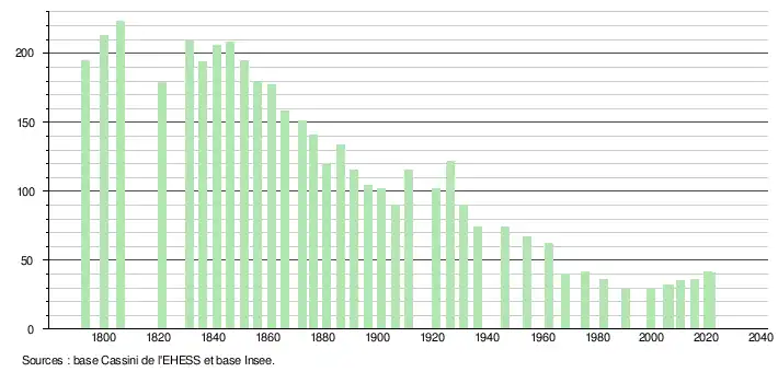 L'évolution du nombre d'habitants est connue à travers les recensements de la population effectués dans la commune depuis 1793. Pour les communes de moins de 10 000 habitants, une enquête de recensement portant sur toute la population est réalisée tous les cinq ans, les populations légales des années intermédiaires étant quant à elles estimées par interpolation ou extrapolation[14]. Pour la commune, le premier recensement exhaustif entrant dans le cadre du nouveau dispositif a été réalisé en 2005[15].