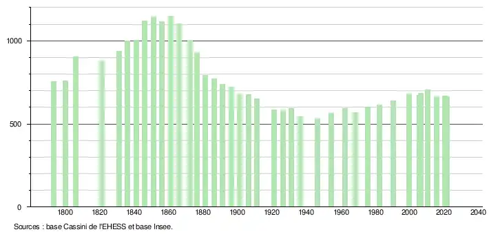 L'évolution du nombre d'habitants est connue à travers les recensements de la population effectués dans la commune depuis 1793. Pour les communes de moins de 10 000 habitants, une enquête de recensement portant sur toute la population est réalisée tous les cinq ans, les populations légales des années intermédiaires étant quant à elles estimées par interpolation ou extrapolation[18]. Pour la commune, le premier recensement exhaustif entrant dans le cadre du nouveau dispositif a été réalisé en 2005[19].