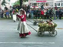 Depuis, le défilé, démarrant le samedi matin de la Sonnenstrasse, rue de Munich, marque le début de l'Oktoberfest. Il est mené par une jeune fille déguisée en moine, le Münchner Kindl, symbole de la ville, et par le maire en fonction[49],[47]. On trouve dans ce défilé de magnifiques attelages tirant des chariots portant des tonneaux (vides de nos jours) aux couleurs de chaque brasserie, ainsi que des chariots dans lesquels se trouvent les serveurs et brasseurs allant officier pour deux semaines. Parfois, des orchestres de Guggenmusik défilent également[50].