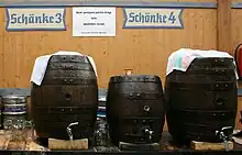 Toutes les brasseries munichoises — Augustiner, Hacker-Pschorr, Hofbräu München, Löwenbräu, Paulaner et Spaten — sont présentes à l’Oktoberfest où elles ont au moins une tente. Depuis le , seuls les taverniers de Munich ont le droit de tenir un débit de boisson sur l'Oktoberfest[64]. De nos jours, on compte quatorze grandes tentes permettant d'accueillir environ 10 000 personnes chacune ainsi qu'une quinzaine de tentes plus petites. Une grande partie d'entre elles datent de la fin du XIXe siècle[65],[66].