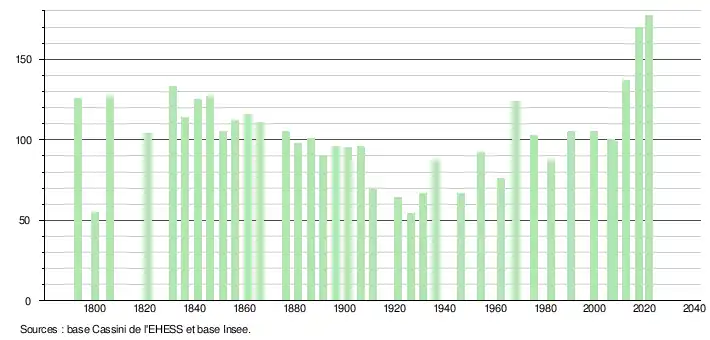 | L'évolution du nombre d'habitants est connue à travers les recensements de la population effectués dans la commune depuis 1793. Pour les communes de moins de 10 000 habitants, une enquête de recensement portant sur toute la population est réalisée tous les cinq ans, les populations légales des années intermédiaires étant quant à elles estimées par interpolation ou extrapolation[25]. Pour la commune, le premier recensement exhaustif entrant dans le cadre du nouveau dispositif a été réalisé en 2007[26]. En 2021, la commune comptait 177 habitants[Note 4], en augmentation de 6,63 % par rapport à 2015 (Hautes-Pyrénées : +1,04 %, France hors Mayotte : +1,84 %). |