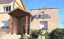 Blason | D'azur à la tour du lieu au naturel accompagnée de trois fleurs de lis d'or, une en chef, deux aux flancs[30]. |