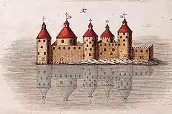 Dans la tour de l'église, il y a une petite chapelle catholique. La cinquième tour, la tour épaisse, a explosé lors d'une explosion de poudre au XVIIIe siècle[14],[13].