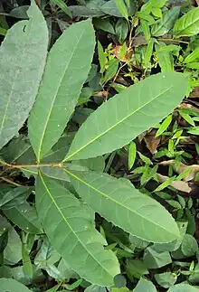 C'est un arbre qui peut atteindre 8 m de haut. Les jeunes branches sont glabres. Les feuilles sont subcoriaces, le limbe est oblong-elliptique de 10 à 16 cm de long et 3 à 6 cm de large, la base est aigüe, atténuée sur le pétiole et l'apex brièvement acuminé. Les bords sont dentelés. Les nervures primaires sont au nombre de 4 à 5 de part et d'autre de la nervure principale, saillantes sur le dessus, légèrement enfoncées sur le dessous, la nervuration est sombre.