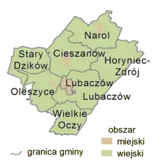 Carte du powiat (partie urbaine en marron et rurale en vert)