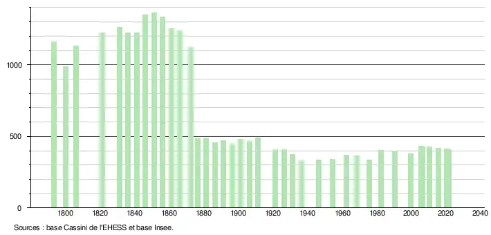 L'évolution du nombre d'habitants est connue à travers les recensements de la population effectués dans la commune depuis 1793. Pour les communes de moins de 10 000 habitants, une enquête de recensement portant sur toute la population est réalisée tous les cinq ans, les populations légales des années intermédiaires étant quant à elles estimées par interpolation ou extrapolation[17]. Pour la commune, le premier recensement exhaustif entrant dans le cadre du nouveau dispositif a été réalisé en 2005[18].