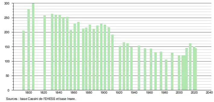 L'évolution du nombre d'habitants est connue à travers les recensements de la population effectués dans la commune depuis 1793. Pour les communes de moins de 10 000 habitants, une enquête de recensement portant sur toute la population est réalisée tous les cinq ans, les populations légales des années intermédiaires étant quant à elles estimées par interpolation ou extrapolation[24]. Pour la commune, le premier recensement exhaustif entrant dans le cadre du nouveau dispositif a été réalisé en 2004[25].