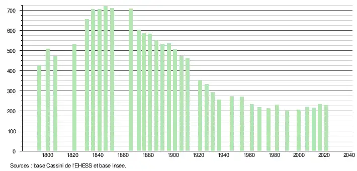 L'évolution du nombre d'habitants est connue à travers les recensements de la population effectués dans la commune depuis 1793. Pour les communes de moins de 10 000 habitants, une enquête de recensement portant sur toute la population est réalisée tous les cinq ans, les populations légales des années intermédiaires étant quant à elles estimées par interpolation ou extrapolation[17]. Pour la commune, le premier recensement exhaustif entrant dans le cadre du nouveau dispositif a été réalisé en 2006[18].