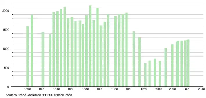 L'évolution du nombre d'habitants est connue à travers les recensements de la population effectués dans la commune depuis 1800. Pour les communes de moins de 10 000 habitants, une enquête de recensement portant sur toute la population est réalisée tous les cinq ans, les populations légales des années intermédiaires étant quant à elles estimées par interpolation ou extrapolation[23]. Pour la commune, le premier recensement exhaustif entrant dans le cadre du nouveau dispositif a été réalisé en 2007[24].