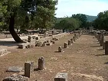 1. Propylée nord-est ; 2. Prytanée ; 3. Philippéion ; 4. Héraion ; 5. Pélopéion ; 6. Nymphée d'Hérode Atticus ; 7. Métrôon ; 8. Zanes ; 9. Crypte (passage voûté vers le stade) ; 10. Stade ; 11. Stoa d'Écho ; 12. Monument de Ptolémée II et Arsinoé ; 13. Stoa d'Hestia ; 14. Bâtiment hellénistique ; 15. Temple de Zeus ; 16. Autel de Zeus ; 17. Ex-voto des Achéens ; 18. Ex-voto de Mikythos ; 19. Victoire de Paionios ; 20. Gymnase ; 21. Palestre ; 22. Théokoléon ; 23. Hérôon ; 24. Atelier de Phidias et basilique paléochrétienne ; 25. Thermes du Kladéos ; 26. Bains grecs ; 27 et 28. Hôtelleries ; 29. Léonidaion ; 30. Thermes sud ; 31. Bouleutérion ; 32. Stoa sud ; 33. Villa de Néron.