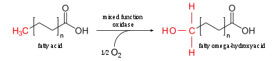 Hydroxylation : le carbone ω est hydroxylé par une monooxygénase fonctionnant avec le cytochrome P450 et un cofacteur NADPH. Ces réactions sont catalysées par des oxydases à fonction mixte : |