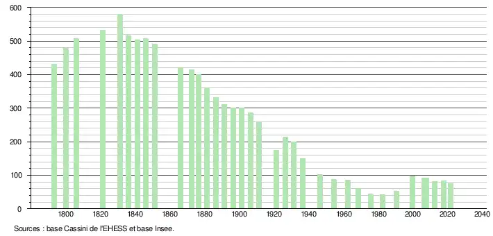 L'évolution du nombre d'habitants est connue à travers les recensements de la population effectués dans la commune depuis 1793. Pour les communes de moins de 10 000 habitants, une enquête de recensement portant sur toute la population est réalisée tous les cinq ans, les populations légales des années intermédiaires étant quant à elles estimées par interpolation ou extrapolation[18]. Pour la commune, le premier recensement exhaustif entrant dans le cadre du nouveau dispositif a été réalisé en 2007[19].