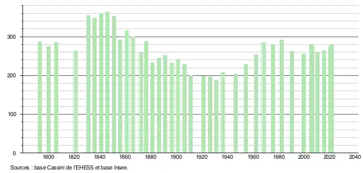 L'évolution du nombre d'habitants est connue à travers les recensements de la population effectués dans la commune depuis 1793. Pour les communes de moins de 10 000 habitants, une enquête de recensement portant sur toute la population est réalisée tous les cinq ans, les populations légales des années intermédiaires étant quant à elles estimées par interpolation ou extrapolation[22]. Pour la commune, le premier recensement exhaustif entrant dans le cadre du nouveau dispositif a été réalisé en 2005[23].