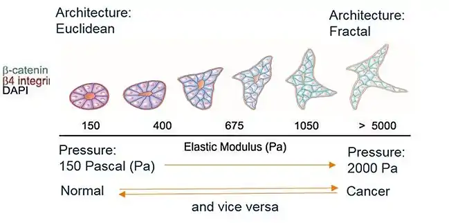 Puis la fractalité du cancer a été démontrée sur différentes structures de l’organe cancer - néoangiogénèse, zone de croissance de la tumeur, tissu tumoral… - et à l’échelle microscopique : noyau cellulaire, surface cellulaire…[45],[46],[47].