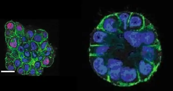 Des cellules malignes du sein cultivées in vitro en 3D forment une masse « désorganisée » (traduire fractale) à gauche sur la photo.