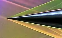 - le choc détaché (bow shock) à l'avant d'un corps émoussé. Pour un objet axisymétrique il est constitué d'une partie droite sur l'axe (angle ), puis se courbe vers l'arrière pour tendre vers l'angle de Mach défini par définissant l'onde de Mach[11]. Celle-ci est une dégénérescence de l'onde de choc vers une onde sonore simple. Cela permet de justifier l'explication courante du cône de choc par l'enveloppe des sphères de perturbation sonores partant de l'objet à divers instants. Cette enveloppe n'est donc une bonne approximation qu'à une distance de l'objet grande devant la taille de celui-ci.