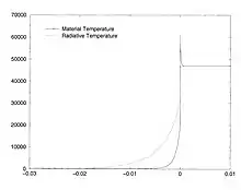 Pour des chocs forts dans un gaz la température monte à plusieurs milliers de degrés, valeur pour lesquelles le rayonnement joue un rôle important. Ceci est vrai derrière le choc et le rayonnement induit remonte d'une part en amont pour créer une zone de préchauffage baptisée « précurseur » et d'autre part en aval où il crée localement les températures les plus hautes avant de relaxer vers la température prévue pour le fluide seul[7]. Cette région plus chaude est moins étendue que la région délimitant le précurseur à cause d'une absorption radiative plus importante. D'une façon générale, le fluide et le rayonnement ne sont pas en équilibre thermodynamique et ont des températures différentes[Note 1]. Les relations de Rankine-Hugoniot restent valides en prenant en compte la température (inconnue) avant choc.