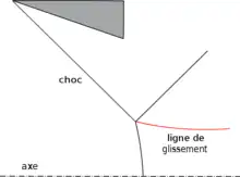 - Lorsque l'angle d'incidence est faible il se crée une configuration particulière en Y. Le point triple (le sommet de la barre verticale du Y) crée une ligne de glissement[11]. Ce phénomène provoque l'apparition de quatre régions différentes.
