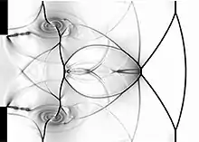 L'interaction de deux chocs se caractérise par une réfraction mutuelle et la création d'une ligne de glissement au point d'intersection, créant cinq régions de propriétés différentes. Toutefois ceci n'est vrai que pour un milieu infini. Dans la pratique on trouve des configurations plus complexes, par exemple les entrées d'air d'engins supersoniques[13]. Une liste d'interactions possibles a été proposée par Barry E. Edney[14] qui a donné son nom à celles-ci : on parle d'une interaction de type « Edney I / II / ... ».