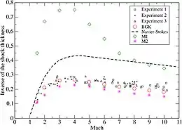Le profil du choc est généralement caractérisé par celui de sa masse volumique, accessible à la mesure. Ce profil dépendant de divers paramètres, on le caractérise par l'« inverse de l'épaisseur du choc », c'est-à-dire par la quantité , étant le saut à la traversée du choc. La description mathématique du milieu fait appel à l'équation de Boltzmann. Il n'existe pas de solution analytique et on fait appel pour ce problème à diverses méthodes : Monte Carlo, méthode BGK, méthodes aux moments d'ordre élevé[10].