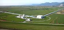 La première génération de détecteurs interférométriques d'ondes gravitationnelles comprend six instruments de grandes dimensions. Le projet américain LIGO consiste en trois instruments kilométriques situés au complexe nucléaire de Hanford WA (ce site accueille deux interféromètres dans la même enceinte) et Livingston LA[43]. Le projet franco-italien Virgo situé à Cascina près de Pise (Italie) possède un instrument de même classe. Le projet germano-britannique GEO600 localisé à Hanovre (Allemagne) aux dimensions plus modestes (300 mètres) vient compléter cet ensemble. Le projet japonais TAMA de taille similaire à GEO est actuellement démantelé. Malgré des différences technologiques importantes, tous ces instruments suivent le même principe[Note 3]. Tous captent la distorsion de l'espace-temps qu'exerce une onde gravitationnelle en mesurant avec une grande précision la différence de longueur du chemin optique suivi par deux faisceaux laser se propageant dans deux directions orthogonales. En pratique on utilise l'interférométrie pour réaliser cette mesure comme indiqué sur le schéma ci-contre. Observer une variation de la différence de longueur revient à observer une variation de la différence de phase entre les deux faisceaux, donc une variation de leur figure d'interférence.