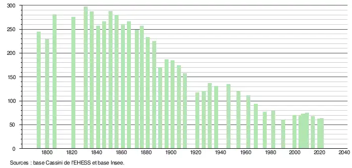 L'évolution du nombre d'habitants est connue à travers les recensements de la population effectués dans la commune depuis 1793. Pour les communes de moins de 10 000 habitants, une enquête de recensement portant sur toute la population est réalisée tous les cinq ans, les populations légales des années intermédiaires étant quant à elles estimées par interpolation ou extrapolation[15]. Pour la commune, le premier recensement exhaustif entrant dans le cadre du nouveau dispositif a été réalisé en 2004[16].