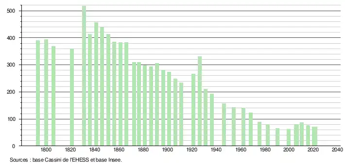 L'évolution du nombre d'habitants est connue à travers les recensements de la population effectués dans la commune depuis 1793. Pour les communes de moins de 10 000 habitants, une enquête de recensement portant sur toute la population est réalisée tous les cinq ans, les populations légales des années intermédiaires étant quant à elles estimées par interpolation ou extrapolation[18]. Pour la commune, le premier recensement exhaustif entrant dans le cadre du nouveau dispositif a été réalisé en 2005[19].