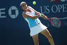 À l'US Open de 2022, elle retrouve sa forme en atteignant les quarts de finale pour la première fois dans ce tournoi en battant la 31e tête de série, Shelby Rogers, puis la 18e tête de série, Veronika Kudermetova, en deux sets pour enregistrer sa première victoire en quatre rencontres. Elle devient la première femme arabe[101] et la troisième femme africaine à se qualifier pour les quarts de finale de l'ère Open, la première de la partie nord du continent. Les autres femmes africaines à avoir atteint les quarts de finale de l'US Open sont Maryna Godwin (en) (1968) et Amanda Coetzer (1994, 1996 et 1998), toutes deux originaires d'Afrique du Sud[102]. Cependant, bien qu'elle ait finalement réussi à atteindre la finale (faisant d'elle la première femme africaine et la première femme arabe à le faire)[103], elle perd contre Świątek en deux sets[104]. Elle retrouve son meilleur classement, la place de dauphine, derrière Świątek, à l'issue du tournoi.