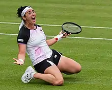 Fin juin, elle dispute Wimbledon et remporte son premier match contre Rebecca Peterson (6-2, 6-1)[52]. Elle élimine ensuite l'Américaine Venus Williams, quintuple vainqueure du tournoi (7-5, 6-0)[53], puis Garbiñe Muguruza, douzième mondiale en trois sets (5-7, 6-3, 6-2)[54], devenant la première femme arabe qualifiée en huitièmes de finale à Wimbledon[55]. Elle renverse ensuite la Polonaise Iga Świątek, septième joueuse mondiale en trois sets (5-7, 6-1, 6-1)[56] et atteint le deuxième quart de finale en Grand Chelem de sa carrière, le premier à Wimbledon. Elle plie lors du match suivant contre la Biélorusse Sabalenka (4-6, 3-6) pour la deuxième fois de l'année[57].