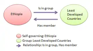 - Une classe est définie comme un ensemble d’individus partageant des propriétés communes. Par exemple, comme l’indique la Figure 1, Éthiopie, un objet du monde réel, est définie comme un individu. Les propriétés communes des individus (Éthiopie, République de Corée, Italie, etc.) sont définies à partir de l’établissement d’une classe appelée « autonomes ». Ainsi, dans la figure 1, le cercle rose à gauche correspond à la classe « autonome » et « Éthiopie » est un individu contenu dans la classe « autonome ». Le cercle vert à droite représente la classe « groupe » et « pays les moins avancés » est un individu inclus dans la classe « groupe ».
