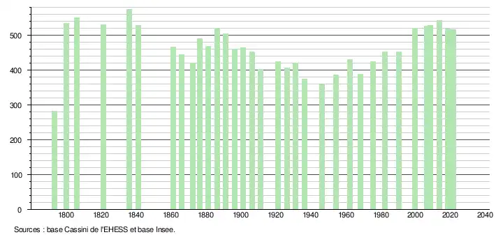L'évolution du nombre d'habitants est connue à travers les recensements de la population effectués dans la commune depuis 1793. Pour les communes de moins de 10 000 habitants, une enquête de recensement portant sur toute la population est réalisée tous les cinq ans, les populations légales des années intermédiaires étant quant à elles estimées par interpolation ou extrapolation[19]. Pour la commune, le premier recensement exhaustif entrant dans le cadre du nouveau dispositif a été réalisé en 2008[20].