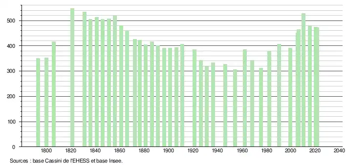 L'évolution du nombre d'habitants est connue à travers les recensements de la population effectués dans la commune depuis 1793. Pour les communes de moins de 10 000 habitants, une enquête de recensement portant sur toute la population est réalisée tous les cinq ans, les populations légales des années intermédiaires étant quant à elles estimées par interpolation ou extrapolation[23]. Pour la commune, le premier recensement exhaustif entrant dans le cadre du nouveau dispositif a été réalisé en 2005[24].