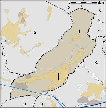 Oostrozebeke, sections et communes voisines. Les zones en jaunes représentent les agglomérations.