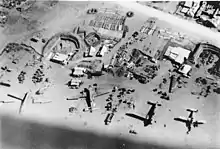 Atelier de réparation de l'aérodrome de Máleme en août 1941. Trop fortement gardé, il n'a pu être attaqué par les commandos débarqués par le sous-marin grec Papanikolis (Y-2).