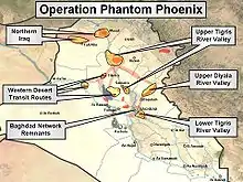 - depuis , les restes de l'EII sont pourchassés dans la région située au nord et à l’est du lac Hamrin (en) et de la chaîne d'Harmin. Il s’agit d’interdire la circulation des insurgés vers le Nord (Tikrit/Mossoul) et le sud-ouest (réinfiltration de Bakouba). Ceux-ci sont donc confinés aux zones frontalières avec l’Iran où la population est majoritairement chiite ou kurde et où il est quasi impossible de reconstituer des réseaux dans un environnement sécurisé[29].